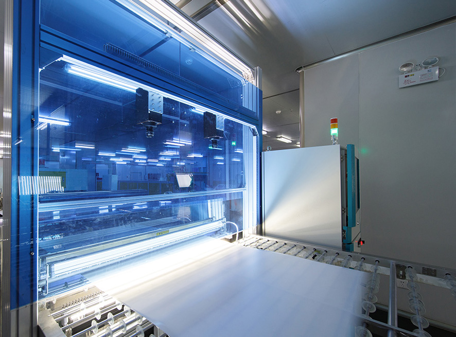 公司現(xiàn)有廠房建筑面積36,000平方米,生產(chǎn)面積26,000平方米,在建廠房面積27,000平方米, 擬新增生產(chǎn)面積26,000平方米。為產(chǎn)出優(yōu)質(zhì)產(chǎn)品,生產(chǎn)車間執(zhí)行潔凈室管理制度, 計(jì)劃新增萬級(jí)無塵車間近萬平方米,局部達(dá)千級(jí)甚至百級(jí)無塵級(jí)別。獨(dú)立車間配備集中供料單元, 提升生產(chǎn)效率;每條擠出線安裝在線CCD檢測(cè)設(shè)備,100%檢測(cè)產(chǎn)品;收料單元全部采用機(jī)械手臂作業(yè), 實(shí)現(xiàn)產(chǎn)品生產(chǎn)全過程自動(dòng)化?,F(xiàn)有質(zhì)量檢測(cè)中心400平方米,配備專業(yè)檢測(cè)儀器約70臺(tái)(套), 主要包括透過霧度儀,熒光光譜儀,高溫高濕箱,藍(lán)光測(cè)試模組等。嚴(yán)格把控各項(xiàng)指標(biāo),為客戶提供優(yōu)質(zhì)產(chǎn)品和服務(wù)。
